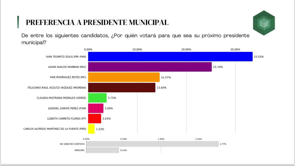 Este resultado confirma la tendencia de diversas casas encuestadoras, que a lo largo del proceso electoral han medido las preferencias electorales, las cuales dan a Iván Teomitzi como el ganador.