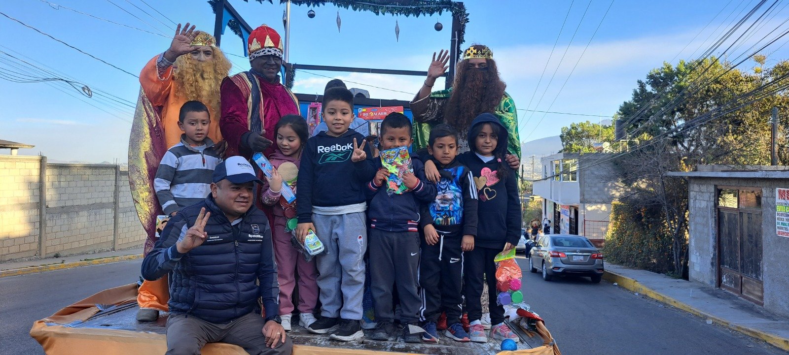 Tlaxcala, Tlax a 4 de enero de 2024/ JL Hertewing / En un ambiente de alegría el presidente municipal de Apetatitlán Ángelo Gutiérrez Hernández acompaño la caravana de los Reyes Magos por las diferentes comunidades del municipio, en su mensaje señalo queremos que todas las niñas y los niños reciban su juguete de parte de Melchor Gaspar y Baltazar y que mejor llegar a sus domicilios donde los pequeños no pensaban que llegarían los Reyes Magos hasta donde viven.