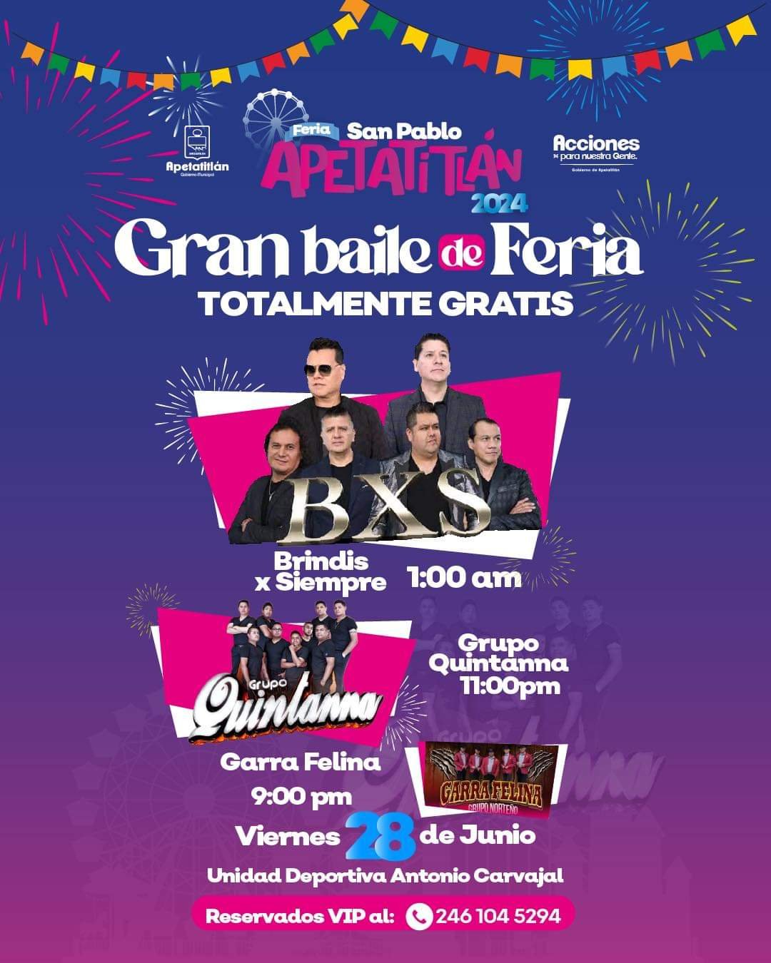 Tlaxcala, Tlax, a 12 de junio de 2024/JL Hertewing/ El gobierno municipal de Apetatitlán que encabeza el alcalde Ángelo Gutiérrez Hernández, dio a conocer parte del programa de la feria “San Pablo Apetatitlán2024”, donde dijo esta es nuestra última feria que presentamos y queremos cerrar con broche de oro, el tradicional baile que atrae miles de personas en esta edición, se llevará a cabo el 28 de junio del año en curso y tendremos a Brindis X Siempre BXS, grupo Quintanna y Garra Felina.
