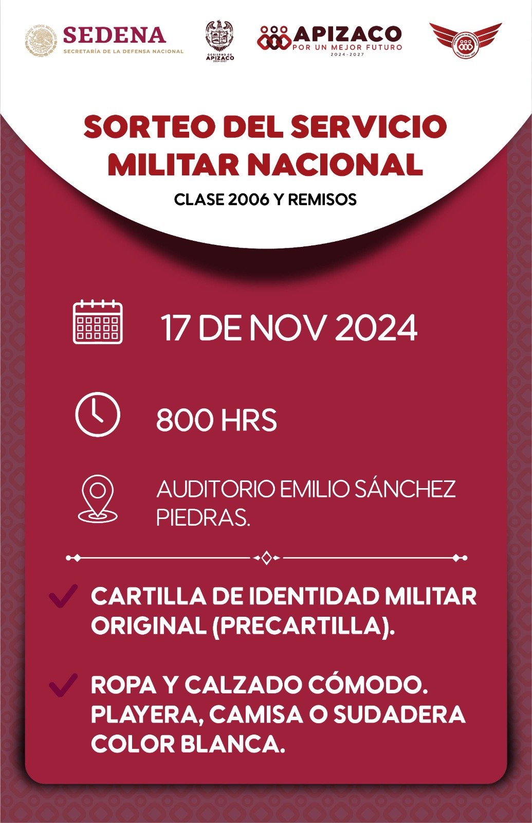 Tlaxcala, Tlax, a 8 de noviembre de 2024/Redacción/ El gobierno municipal de Apizaco que encabeza el alcalde Javier Rivera Bonilla dio a conocer que el próximo domingo 17 del mes en curso se llevara a cabo el sorteo del “Servicio Militar Nacional 2024 para jóvenes que tramitaron su cartilla clase 2006 y remisos.