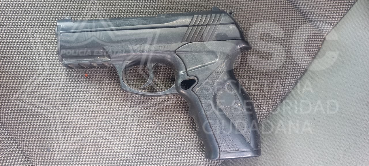 Ante la actitud inusual y evasiva, la SSC detuvo a uno de ellos y explicaron el motivo de su detención provisional, por lo que le realizaron una inspección preventiva, cuyo resultado fue la localización en su cintura de un objeto de plástico color negro con las características similares a las de un arma de fuego tipo pistola.