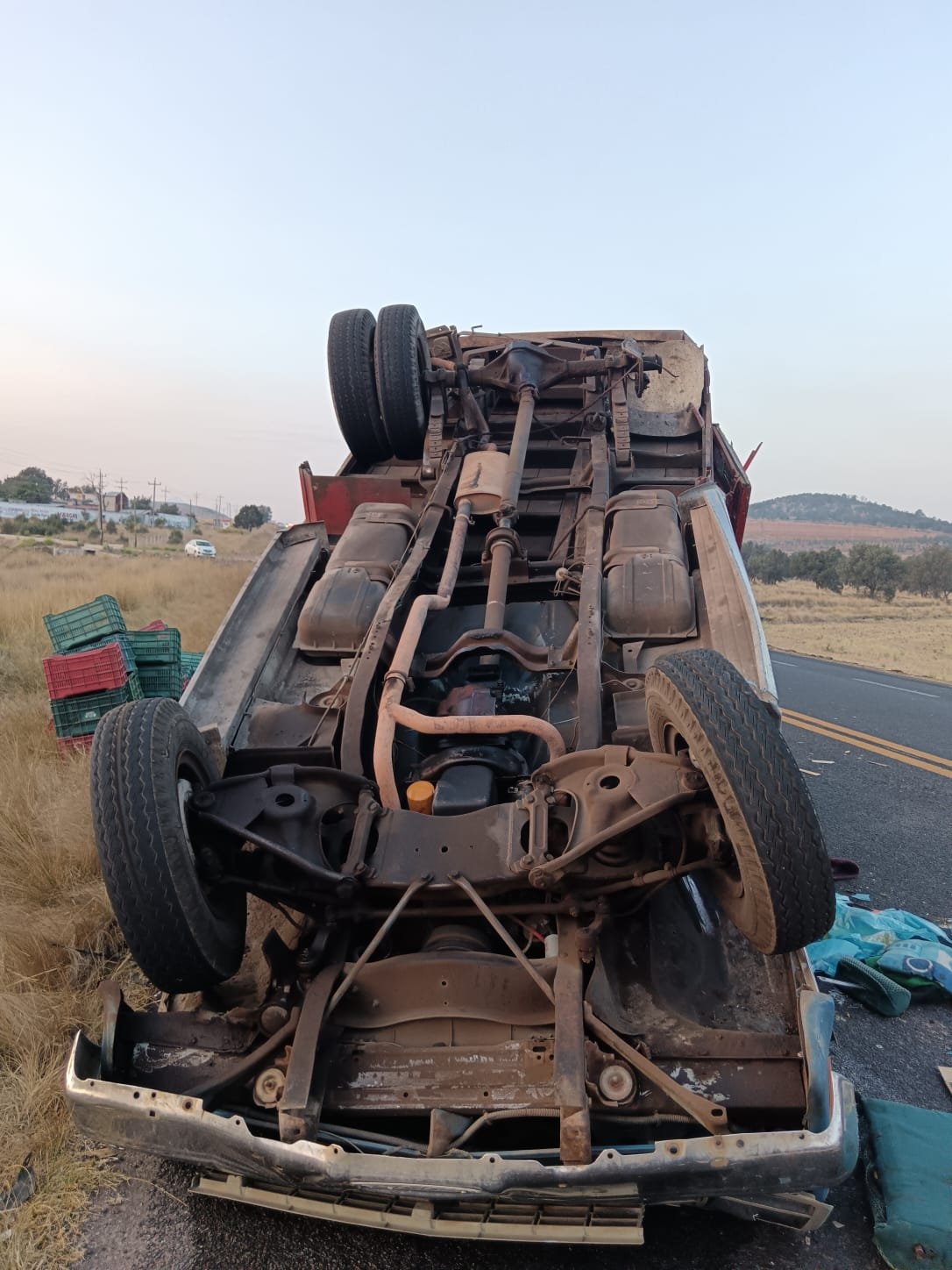 Tlaxcala, Tlax, a 20 de abril de 2024/ JL Hertewing / Elementos de seguridad y personal de protección civil del municipio de Atlangatepec fueron alertados por el 911 que sobre la carretera federal Apizaco-Tlaxco, a la altura de la comunidad de Tepetzala, de dicho municipio se había suscitado un accidente automovilístico donde una camioneta de redilas se había volcado y que se desconocía se había lesionados.