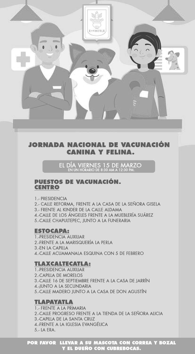 Tlaxcala, Tlax, a 13 de marzo de 2024/Redacción/ La Secretaria de Salud SESA, llevará a cabo este 15 de marzo del año en curso la jornada Nacional de Vacunación contra la rabia en perros y gatos en el municipio de Ayometla, donde se instalarán 19 módulos repartidos entre la cabecera municipal y las tres comunidades donde se atenderán en un horario de 08:30 am a 12:30 pm.