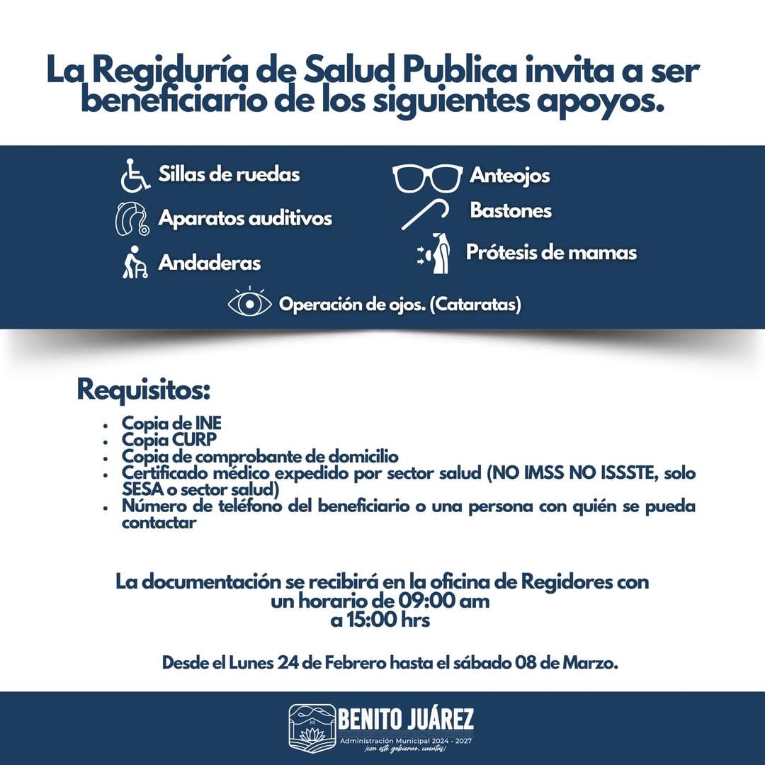 Tlaxcala, Tlax, a 24 de febrero del 2025/Redacción/ El gobierno municipal de Benito Juárez que encabeza el alcalde Rubén Becerra Cerón, a través de la regiduría de salud pública, dieron a conocer que se abrió el programa para que puedan adquirir aparatos funcionales y hasta una operación, dicha apertura para recepción de documentos será del 24 de febrero al 8 de marzo del año en curso, en la oficina de la regiduría de salud pública que se encuentra en el interior de la presidencia municipal.