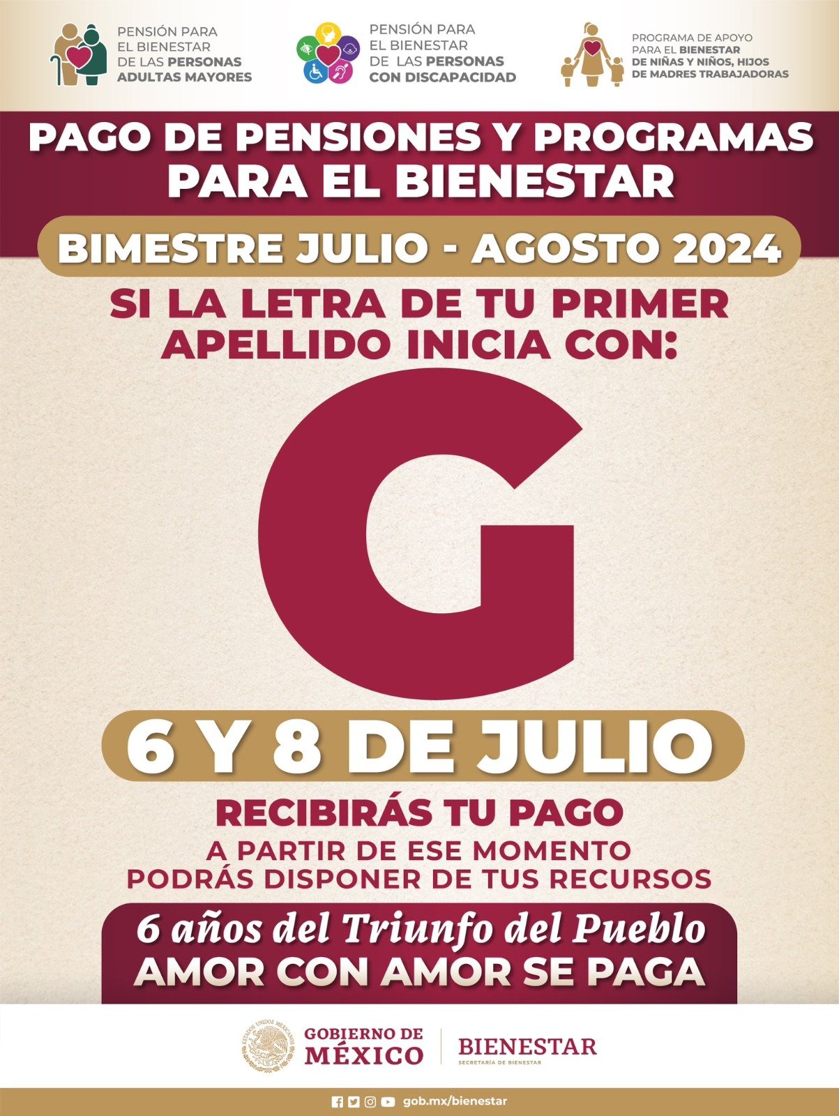 Recordó que se trata de la dispersión bancaria de manera directa y sin intermediarios correspondiente al bimestre julio-agosto a través de la tarjeta del Banco del Bienestar, por lo que su pago se encuentra garantizado, y no es necesario acudir antes de la fecha programada.