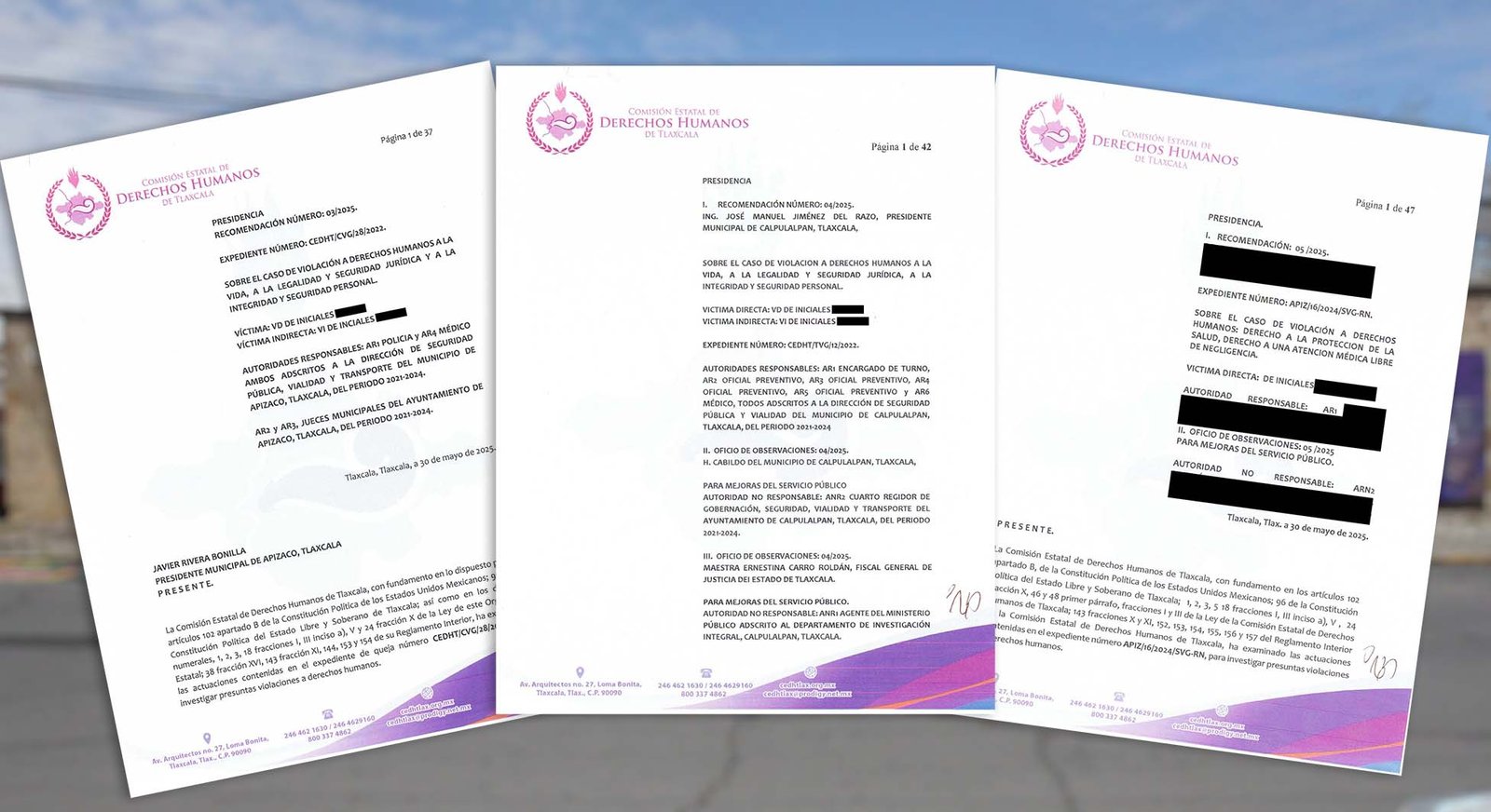 La Comisión Estatal de Derechos Humanos de Tlaxcala (CEDHT) emitió tres recomendaciones con los números 03/2025, 04/2025 y 05/2025, dirigidas a los Presidentes Municipales de Apizaco y Calpulalpan, y, al Secretario de Salud y Director General del OPD Salud de Tlaxcala, respectivamente.