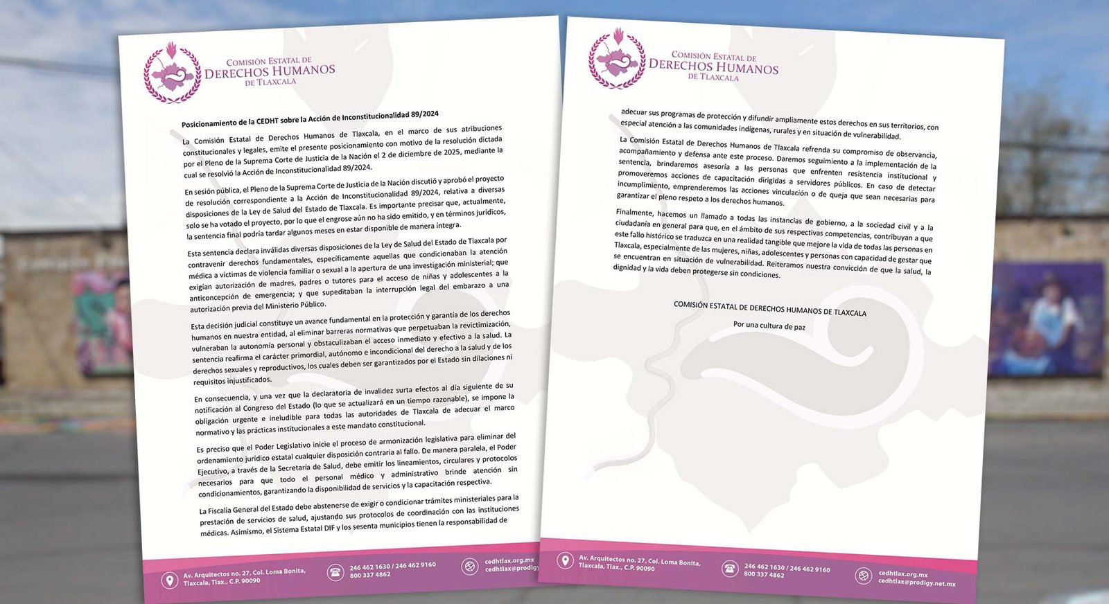 La Comisión Estatal de Derechos Humanos de Tlaxcala, en el marco de sus atribuciones constitucionales y legales, emite el presente posicionamiento con motivo de la resolución dictada por el Pleno de la Suprema Corte de Justicia de la Nación el 2 de diciembre de 2025, mediante la cual se resolvió la Acción de Inconstitucionalidad 89/2024.