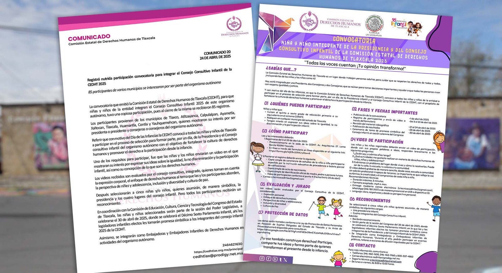 La convocatoria que emitió la Comisión Estatal de Derechos Humanos de Tlaxcala (CEDHT), para que niñas y niños de la entidad integren el Consejo Consultivo Infantil 2025 de este organismo autónomo, tuvo una copiosa participación, pues al cierre de la misma se recibieron 85 registros.