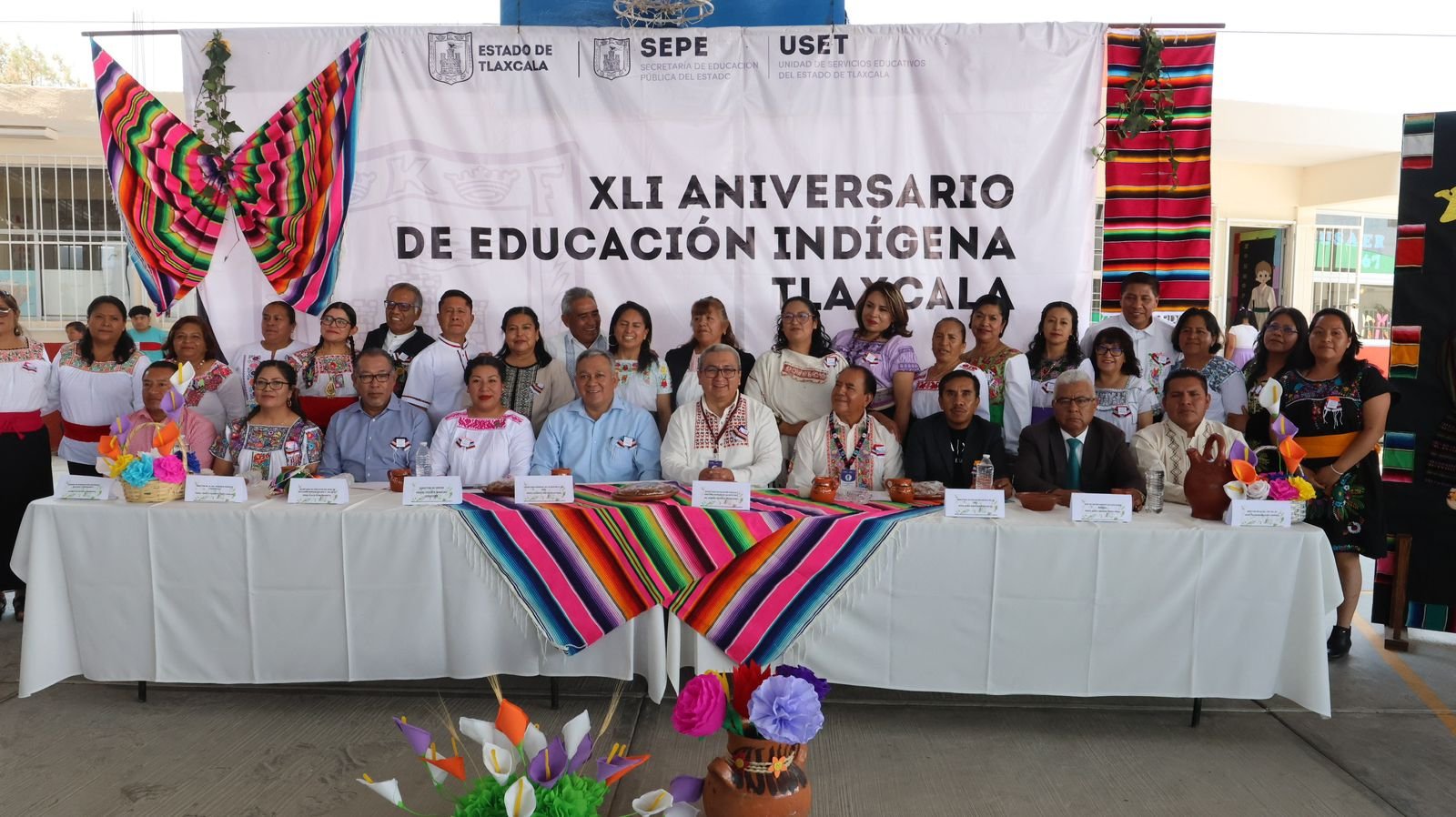 Autoridades de la Secretaría de Educación Pública del Estado y de la Unidad de Servicios Educativos del Estado de Tlaxcala (SEPE-USET) celebraron el XLI aniversario de educación indígena, con la participación de alumnos, docentes, directivos, padres de familia y representantes del Sindicato Nacional de Trabajadores de la Educación (SNTE) Sección 31.