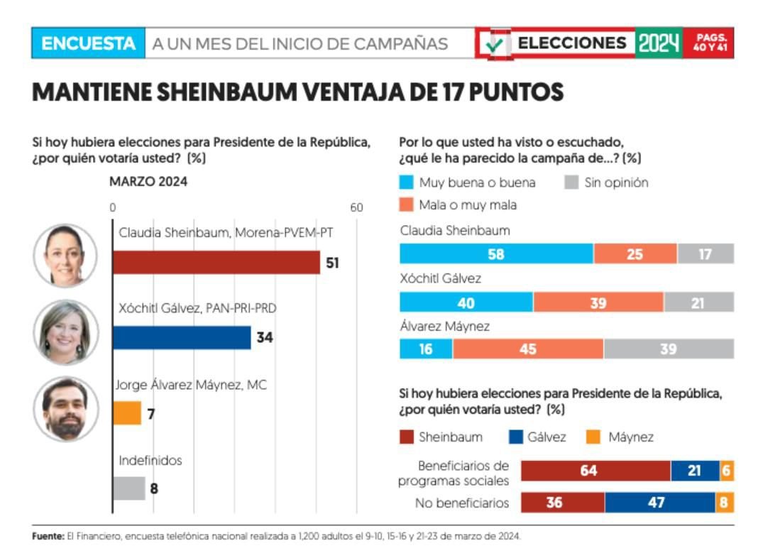 El sondeo indica que las preferencias casi no se movieron en el primer mes de campañas, registrando variaciones de apenas 1 punto porcentual en el apoyo que obtiene cada una de las candidatas y el candidato a la Presidencia respecto del mes anterior. No obstante, el apoyo que las candidatas punteras captan entre la población que recibe apoyos o beneficios de programas sociales y la que no obtiene esos apoyos denota dos escenarios: entre el electorado beneficiario de programas sociales, Sheinbaum obtiene 64% de la intención de voto y Gálvez 21%, una diferencia de 43 puntos.