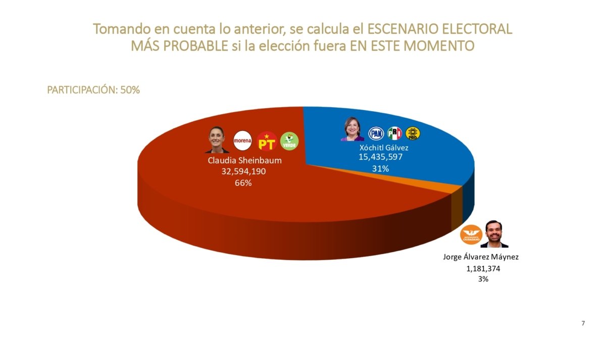 Con una estimación de 32 millones de votantes, Sheinbaum alcanzaría el 66% del voto, mientras que Xóchitl Gálvez tendría un 31% del voto al obtener 15 millones de sufragios. Muy por debajo, Jorge Álvarez Máynez obtendría solo un 3% de los votos.