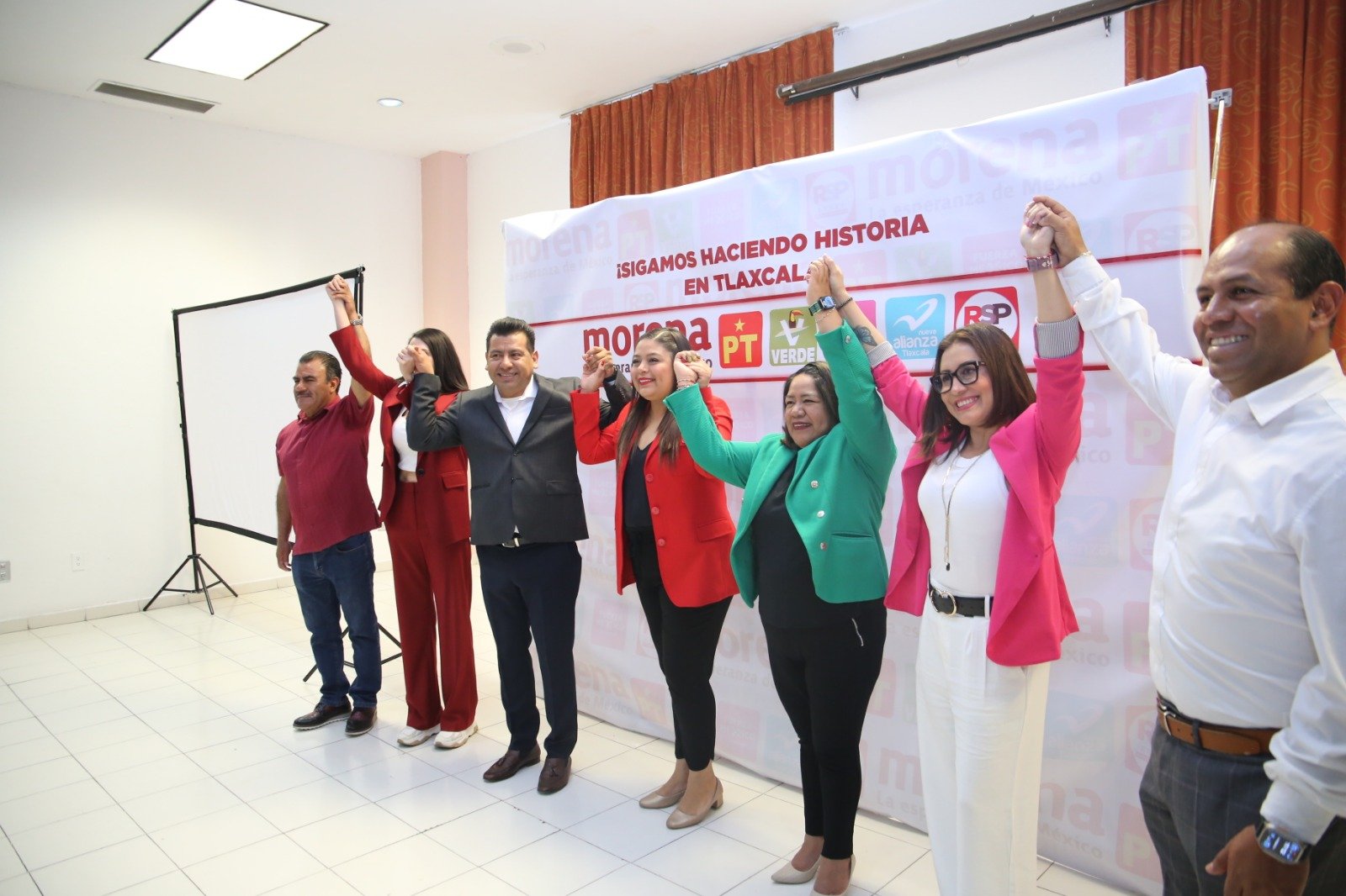 El dirigente estatal de morena Carlos Augusto Pérez Hernández estuvo acompañado de Aurora Villeda Temoltzin de RSP, Irma Yordana Garay Loredo del PT, Maribel León Cruz del PVEM, Williams Zainos Flores del PANAL, de Fuerza por México Reyna Flores Báez y Armando Contreras representante de Claudia Sheinbaum en Tlaxcala.