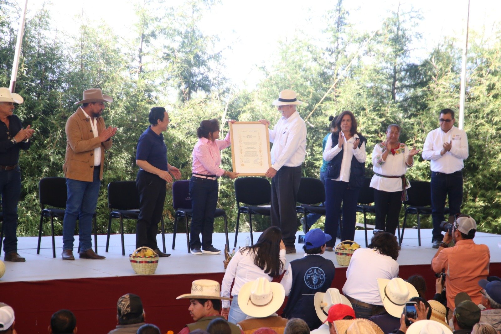 La gobernadora del estado, Lorena Cuéllar Cisneros, participó en la ceremonia de entrega del reconocimiento que la Organización de las Naciones Unidas para la Alimentación y la Agricultura (FAO) otorgó a Tlaxcala por el Sistema Metepantle, en la comunidad de Álvaro Obregón, municipio de Españita.