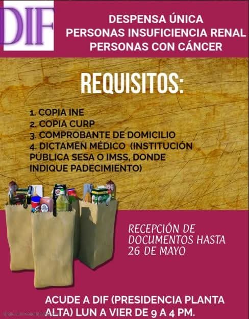 Para recibir esta “despensa única” deberán presentar dictamen médico de institución pública SESA o IMSS Bienestar dónde indique padecimiento, (No estar asegurado IMSS).