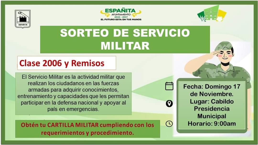 Tlaxcala, Tlax, a 11 de noviembre de 2024/Redacción/ El gobierno municipal de Españita que encabeza el alcalde Juan Carlos Galindo López, así como la Junta Municipal de Reclutamiento y la Secretaria de la defensa Nacional dieron a conocer que el próximo domingo 17 del presente mes se llevara a cabo el sorteo del “Servicio Militar Nacional 2024 para jóvenes que tramitaron su cartilla clase 2006 y remisos, en la sala de cabildo de la presidencia municipal.