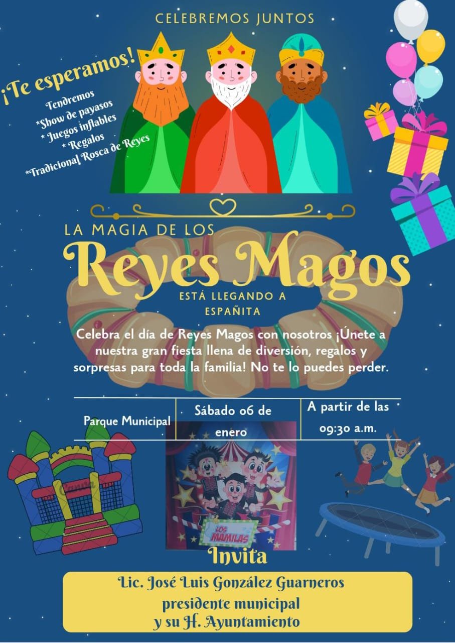 Te esperamos a partir de las 09:30 horas en el parque municipal, donde habrá show de payasos, juegos inflables, regalos, partirán la tradicional rosca y convivirán con los Reyes Magos: José Luis González Guarneros alcalde.