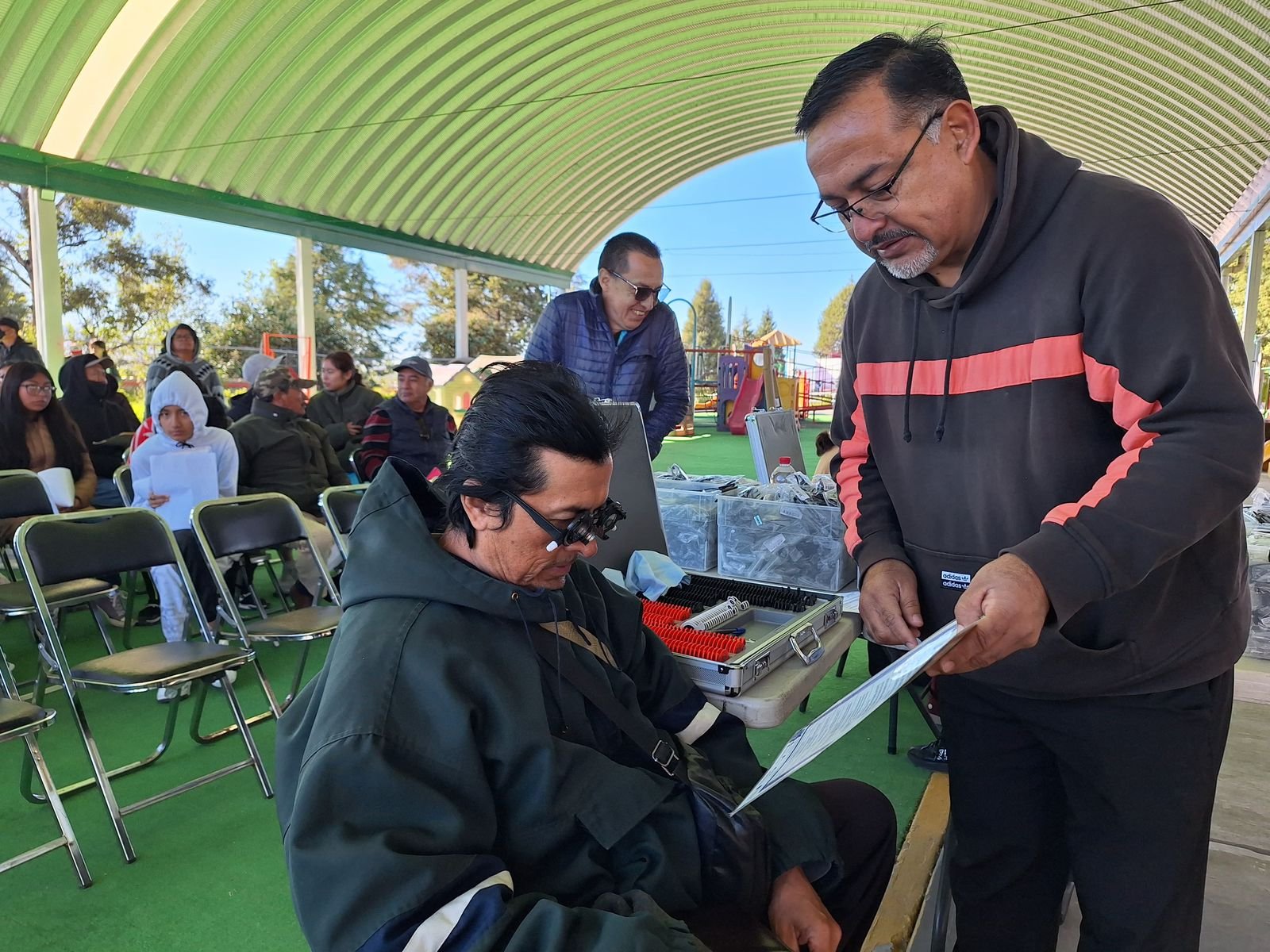 Los beneficiarios fueron revisados uno por uno para conocer sus necesidades de graduación, tamaño de armazón, así como la comodidad.