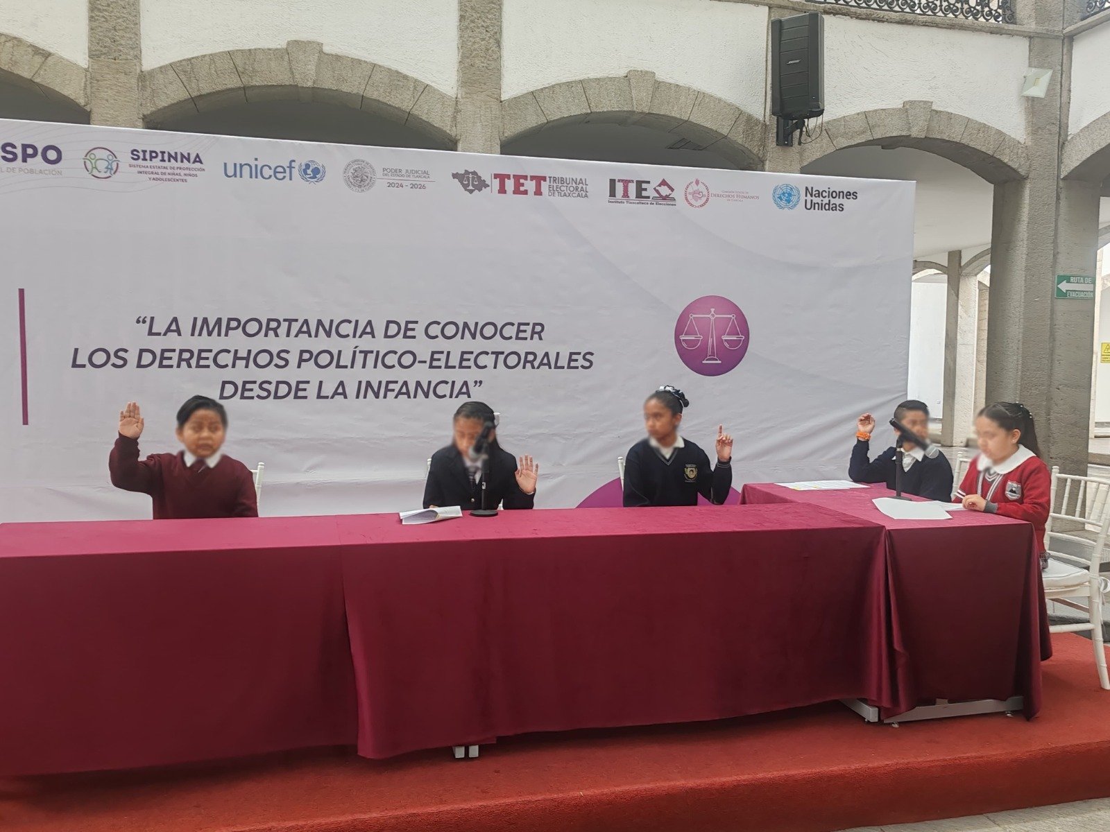 Posteriormente, al evento que también contó con la asistencia de la Presidenta honorífica del Sistema Estatal para el Desarrollo Integral de la Familia (Sedif), Mariana Espinoza de los Monteros Cuéllar, se dio paso a la sesión del Tribunal Electoral Infantil, integrado por: Montserrat Flores Cuatianquiz, del municipio de Santa Isabel XIloxoxtla, de la escuela primaria Ignacio Zaragoza quien fungió como presidenta; mientras que Josep Daniel Ochoa Hernández del municipio de Papalotla, de la escuela primaria Carmen Serdán fue Magistrada Infantil y Wendy Yatxiri Dotor Vázquez, del municipio Amaxac de Guerrero, de la escuela primaria Vicente Guerrero, participó como Magistrada Infantil.