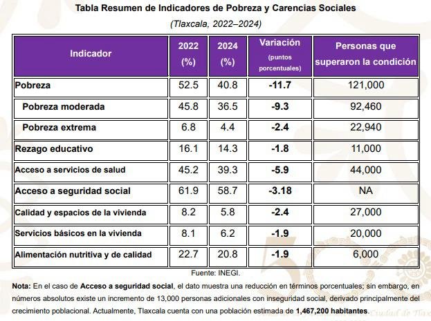 De acuerdo con los resultados de la Medición de la Pobreza Multidimensional publicados por el Instituto Nacional de Estadística y Geografía (INEGI), los tres indicadores de pobreza -multidimensional, moderada y extrema- mostraron una mejora que impactó favorablemente en la población tlaxcalteca, ya que más de 121 mil personas salieron de la pobreza y decenas de miles mejoraron sus condiciones de vida en educación, salud, vivienda, servicios básicos y alimentación.