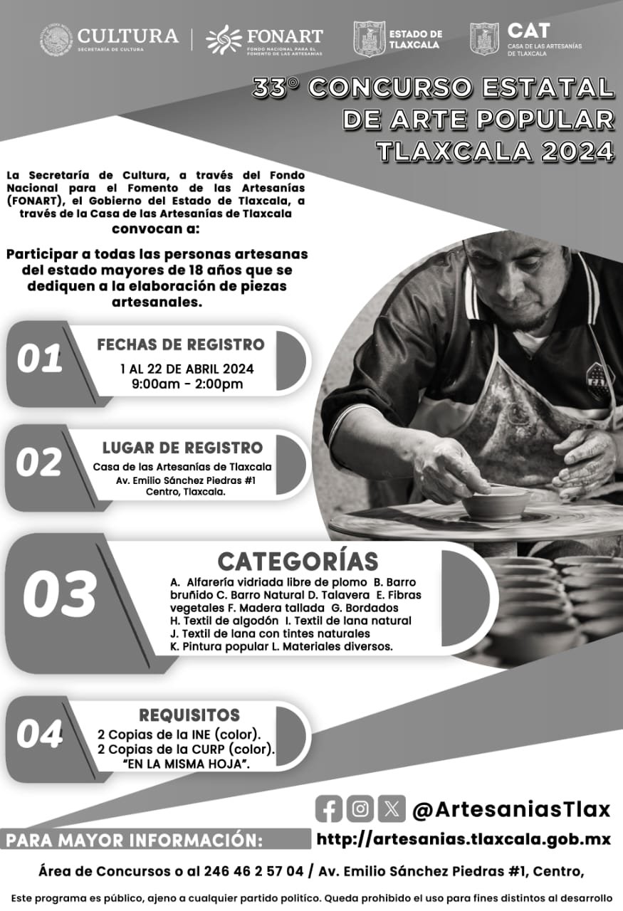La Casa de las Artesanías de Tlaxcala (CAT) invita a los artesanos del estado a participar en el XXXIII Concurso Estatal de Arte Popular Tlaxcala 2024.