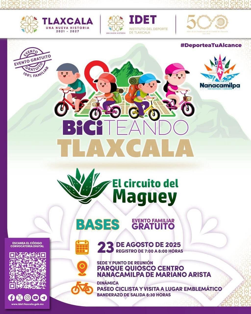 El Instituto del Deporte de Tlaxcala (IDET) invita a ciclistas, público en general, y niños a partir de 10 años, a participar en el programa “Biciteando por Tlaxcala: El Circuito del Maguey”, que se realizará el próximo 23 de agosto, en el municipio de Nanacamilpa.
