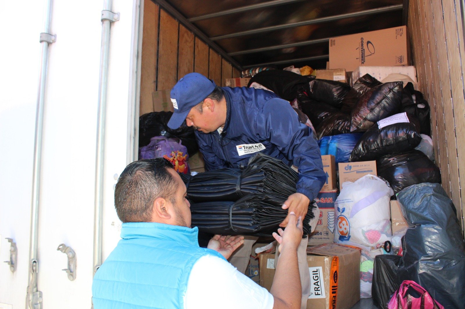 La caravana, compuesta por cuatro tráileres acoplados mediante cajas secas, también transportó ropa, alimentos, agua, despensas y diversos insumos dirigidos a los damnificados.
