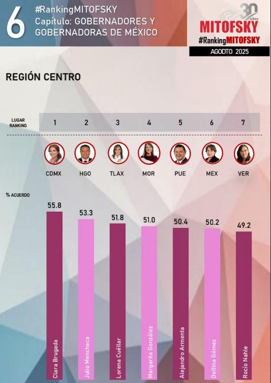 De acuerdo con los resultados de agosto del Ranking de Gobernadores y Gobernadoras de México de Consulta Mitofsky, también es la quinta gobernante afín a la Cuarta Transformación con mayor calificación en el país.