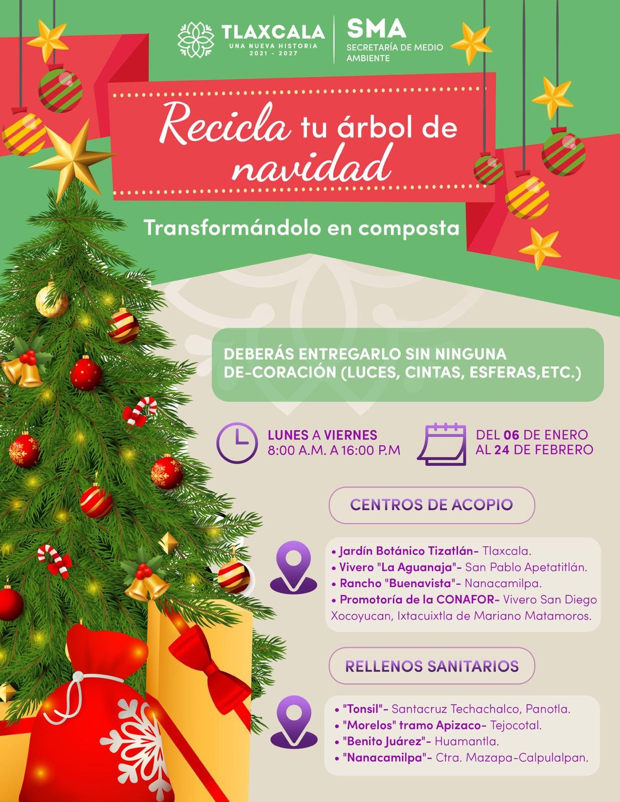 La Secretaría de Medio Ambiente del Estado (SMA) realizará la campaña “Recicla tu Árbol de Navidad” del 6 de enero al 24 de febrero 2025, con el objetivo de fomentar el reciclaje de los recursos naturales y la cultura ambiental por medio de la separación y reutilización de estos ejemplares en compostaje para la propagación de otras especies.