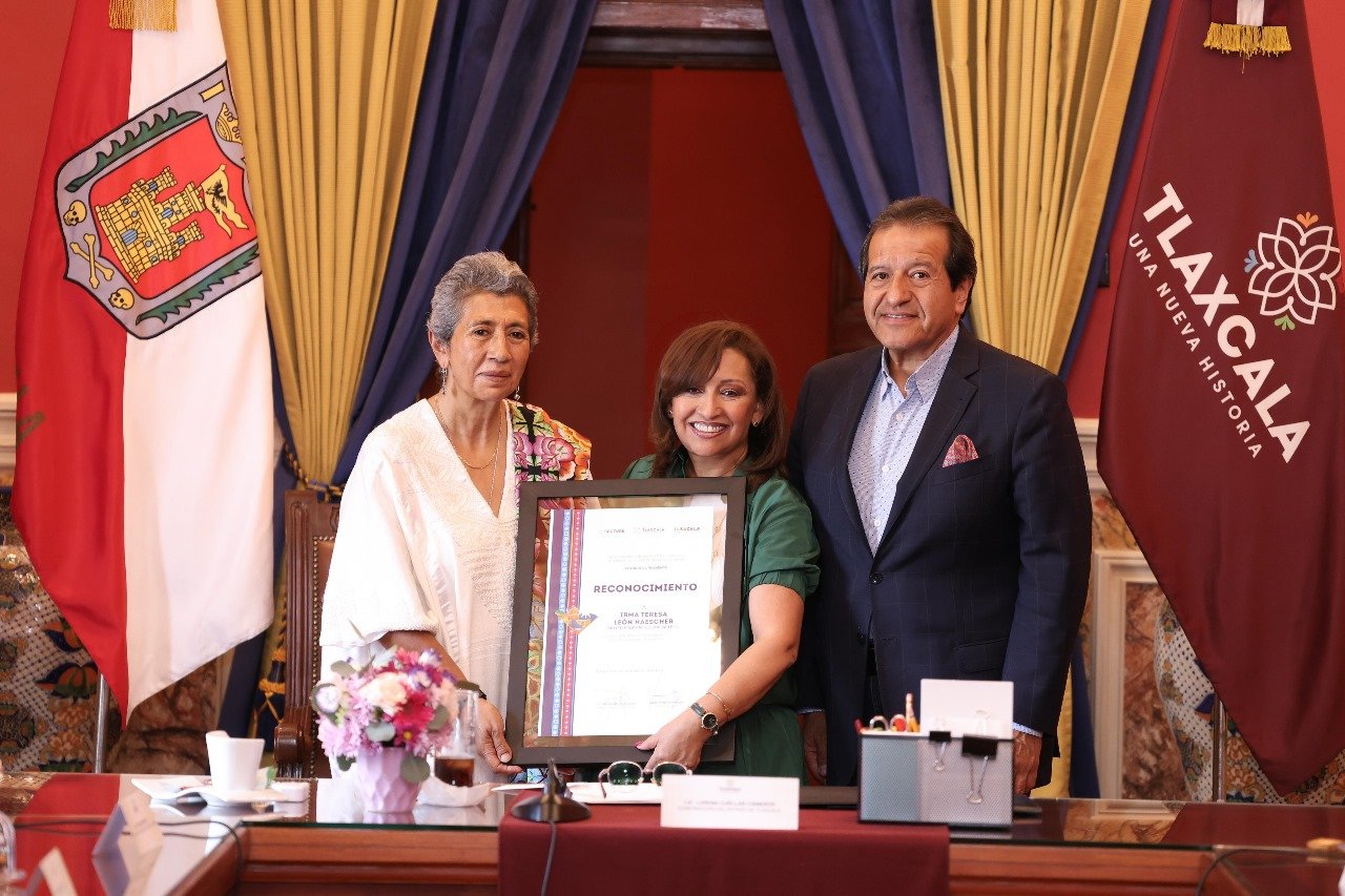 La gobernadora Lorena Cuéllar Cisneros, a través de la Secretaría de Turismo, entregó un reconocimiento a Teresa León Naesher, mujer migrante tlaxcalteca, por su labor ininterrumpida en la promoción turística y cultural de Tlaxcala en Suiza.