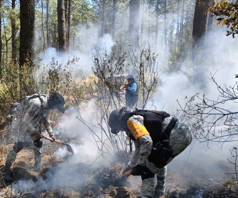 Los combatientes, elementos del Ejército y Guardia Nacional continúan con los trabajos para abrir brechas cortafuego, para evitar la propagación de la conflagración, mientras se realizan sobrevuelos con drones en apoyo a las labores en tierra.