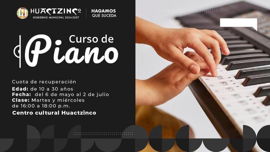 El H. Ayuntamiento de San Juan Huactzinco, a través de la Dirección de Cultura, te invita al “Curso de Piano”, en donde aprenderás las características fundamentales de la música y de este instrumento, entendiendo sus escalas, notas, acordes y octavas, para llevar a cabo la composición musical de una armonía y el desarrollo de recitales.