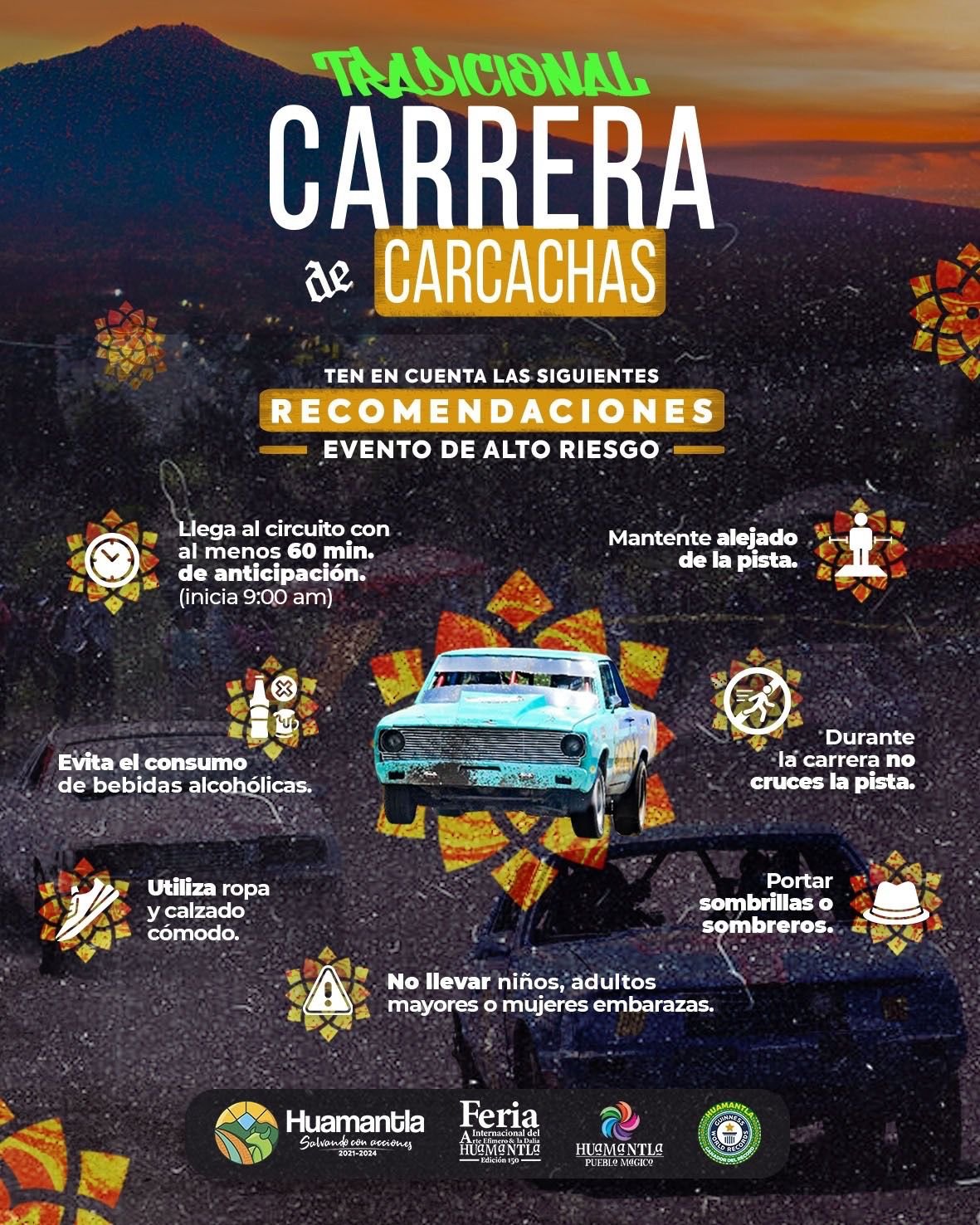 Uno de los eventos más emocionantes de la Feria Internacional del Arte Efímero y la Dalia Huamantla 2024, es la tradicional Carrera de Carcachas; por ello, la Coordinación de Protección Civil de Huamantla, emite las siguientes recomendaciones para garantizar una experiencia segura y agradable para todos los asistentes.
