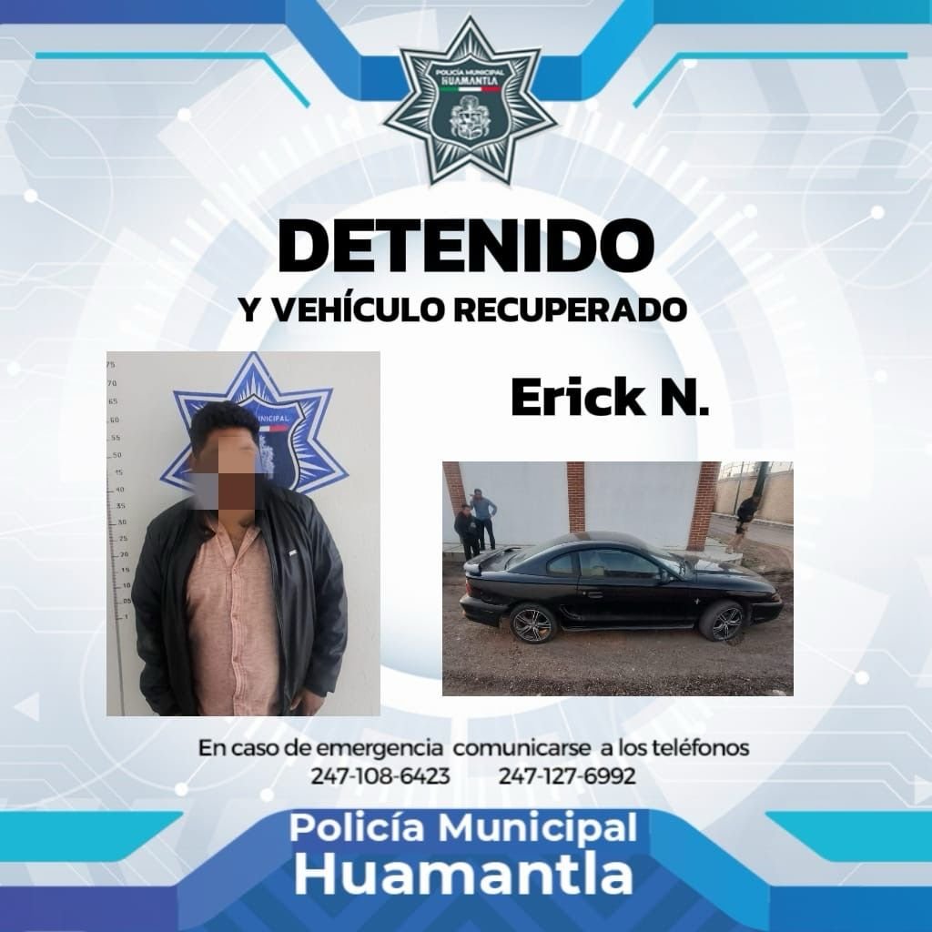 Como resultado de los operativos permanentes de vigilancia, la Policía Municipal de Huamantla logró la detención de Erick “N”, presunto responsable del robo de un automóvil marca Ford, tipo Mustang.