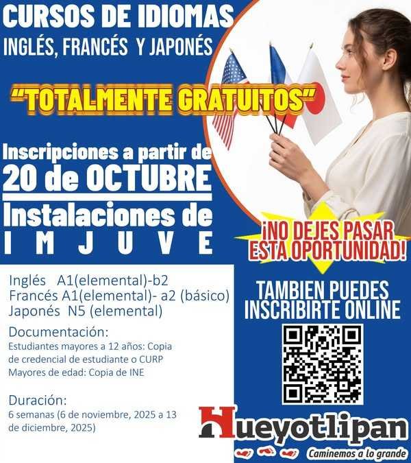 Tlaxcala, Tlax, a 20 de octubre de 2025.- El gobierno municipal de Hueyotlipan que encabeza el alcalde Sostenes Bedolla Espinoza, en coordinación con el Coordinador del IMJUVE, Lic. Ulises Román Sosa, y el Lic. Luis Flores Olivares, invitan a todos los hueyotlipenses a formar parte de los cursos de idiomas: inglés, francés y japonés, ¡una oportunidad única para ampliar tus conocimientos y prepararte para un futuro global!
