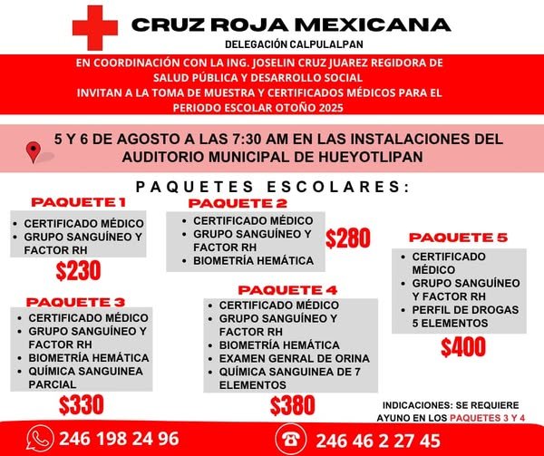 Tlaxcala, Tlax, a 30 de julio de 2025/Redacción/ El H. Ayuntamiento de Hueyotlipan, encabezado por el presidente municipal Sostenes Bedolla Espinoza, en coordinación con la Cruz Roja Mexicana Delegación Calpulalpan y la regidora de Salud Pública y Desarrollo Social, Ing. Joselin Cruz Juárez, te invitan a la toma de muestra y certificados médicos escolares para el periodo Otoño 2025.