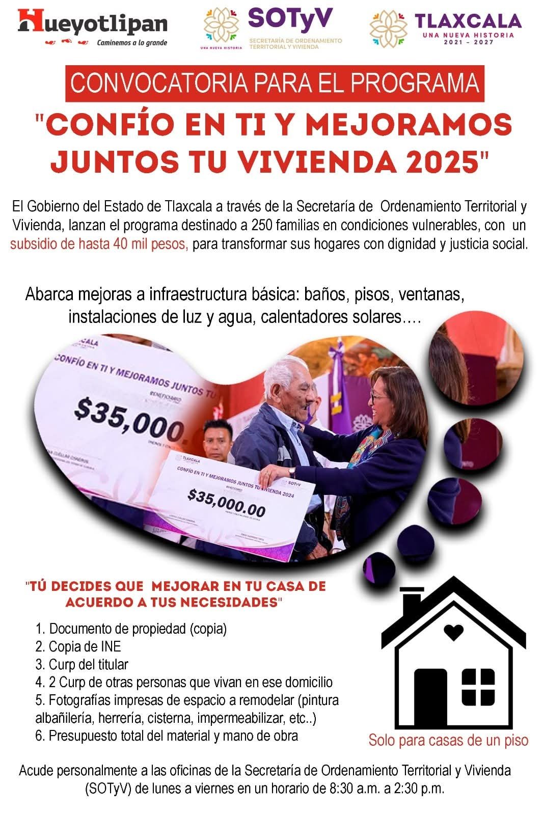 Tlaxcala, Tlax, a 7 de julio de 2025/Redacción/ El gobierno municipal de Hueyotlipan que encabeza el alcalde Sostenes Bedolla Espinoza, impulsa el programa estatal “Confío en ti y mejoramos juntos tu vivienda 2025”, el cual es impulsado por el gobierno del estado que dirige la gobernadora Lorena Cuéllar Cisneros, a través de la Secretaría de Ordenamiento Territorial y Vivienda (SOTyV), donde se abre la convocatoria de dicho programa.