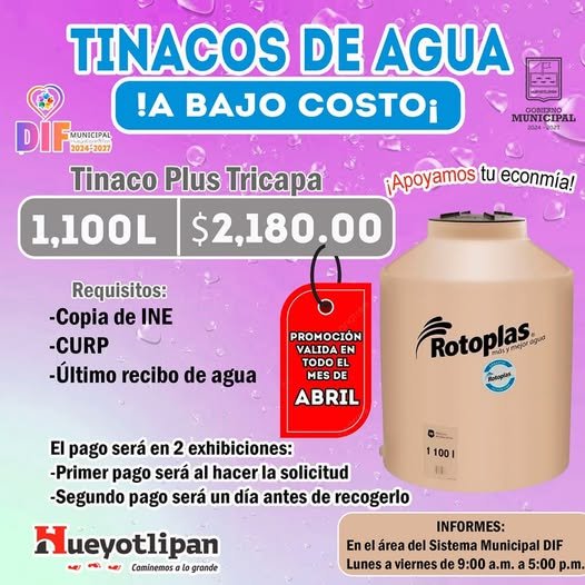 Tlaxcala, Tlax, a 7 de abril de 2025/Redacción/ El gobierno municipal de Hueyotlipan que encabeza el alcalde Sostenes Bedolla Espinoza, a través de Sistema Municipal para el Desarrollo Integral de la Familia (SMDIF), abrió el programa de “tinacos de agua” a bajo costo, en su mensaje el edil señalo en nuestro plan de trabajo que diseñamos al inicio de la administración esta la de bajar diferentes proyectos que estén encaminados a mejorar la economía de los que menos tienen y hoy abrimos ventanilla y vence el 30 de abril para que puedan obtener un tinaco plus tricapa a un precio accesible.
