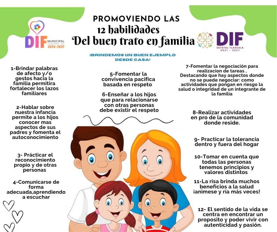 Tlaxcala, Tlax, a 23 de abril de 2025/Redacción/ El gobierno municipal de Hueyotlipan que encabeza el alcalde Sostenes Bedolla Espinoza, en coordinación con el Sistema Estatal para el Desarrollo Integral de la Familia (SEDIF) y el apoyo del DIF municipal, llevaron a cabo la presentación del cartel de las 12 habilidades que fortalecen el buen trato en familia, promoviendo los valores y principios como el respeto, el amor, la amistad, la empatía, la comunicación y la convivencia armónica, por mencionar algunos que fortalecerán el núcleo familiar.