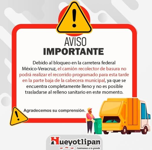 El cierre de carretera que realizan trasportistas y campesinos en la carretera federal Calpulalpan-Apizaco, impide que el camión recolector de basura, se traslade al relleno sanitario a realizar el vaciado de dicha basura y esto también afecta de que no se realice sus rutas programadas afectando principalmente la parte baja de la cabecera municipal.