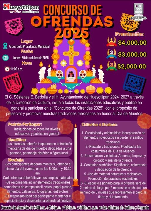 Tlaxcala, Tlax, a 21 de octubre de 2025.- En el marco de la festividad de “Día de Muertos”, el gobierno municipal de Hueyotlipan que encabeza el alcalde Sostenes Bedolla Espinoza, a través de la dirección de cultura del municipio dieron a conocer el cartel de Concurso de Ofrendas 2025, en su mensaje el edil señalo una de las tradiciones con mayor arraigo es esta por lo que tenemos que rescatarla e impulsarla en las nuevas generaciones por lo que será este 30 de octubre del presente año que se realizara dicho concurso por lo que se invita a las diferentes instituciones educativas de este municipio a participar, en esta ocasión la premiación será de 9 mil pesos a repartir entre los tres primeros lugares.