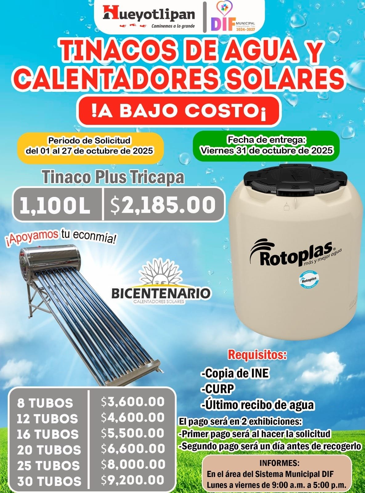 Tlaxcala, Tlax, a 10de octubre de 2025/Redacción/ Mejorar la economía de los ciudadanos de Hueyotlipan es un compromiso es por eso que estamos bajando el costo de diferentes artículos de primera necesidad con un precio menor que en cualquier tienda comercial y a parte los pueden pagar en dos exhibiciones como es el caso ahora de los calentadores solares y los tinacos de diferente capacidad y de varios tubos, así lo dijo el presidente municipal Sostenes Bedolla Espinoza al dar a conocer el programa “a bajo costo”.