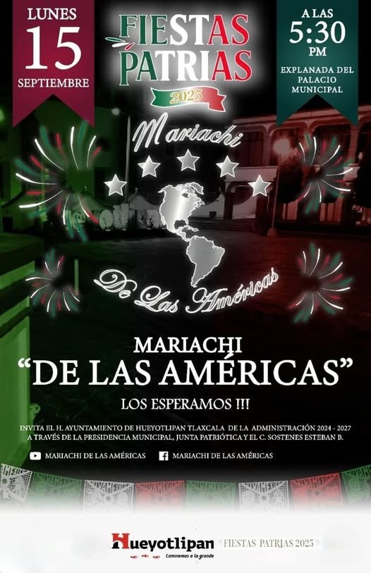 Tlaxcala, Tlax, a 10 de septiembre de 2025/Redacción/ En el marco del CCXV Aniversario de la Independencia de México, El H. Ayuntamiento de Hueyotlipan 2024–2027, que encabeza el presidente municipal Sostenes E. Bedolla, invita a toda la ciudadanía a disfrutar de un ambiente lleno de orgullo, tradición y alegría en el marco de nuestras Fiestas Patrias 2025.
