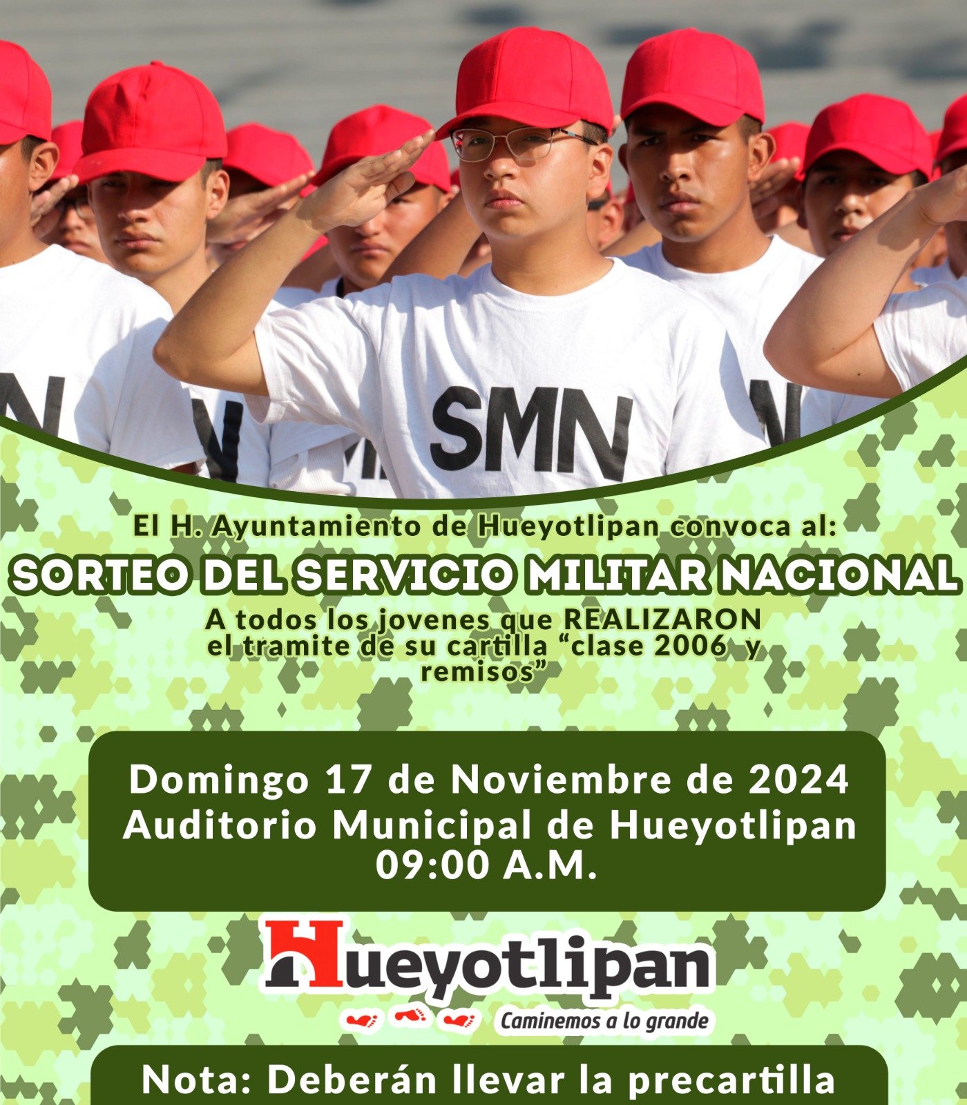 La Secretaría de la Defensa Nacional, a través de la 23/a. Zona Militar, invita a los jóvenes de la clase 2006 y remisos que obtuvieron su cartilla de identidad militar este año, a participar en el sorteo del Servicio Militar Nacional, el cual se realizará el 17 de noviembre de 2024 a las 9:00 a.m. en el Auditorio Municipal de Hueyotlipan.