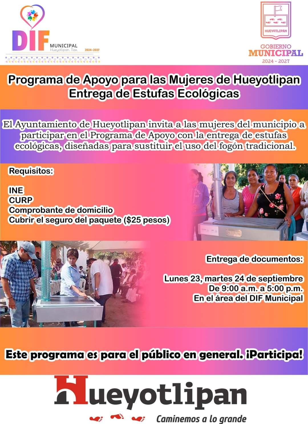 Tlaxcala, Tlax, a 23 de septiembre de 2024/Redacción/ El gobierno municipal de Hueyotlipan que encabeza el alcalde Sostenes Bedolla Espinoza, en coordinación Con el Sistema Municipal para el Desarrollo Integral de la Familia SMDIF invitan a las mujeres de las diferentes comunidades y de la cabecera municipal de este municipio a participar en el programa de apoyo para que obtengan una estufas ecológicas, diseñadas para sustituir la clásica estufa de humo, en su mensaje el alcalde señalo los fogones abiertos dispersan humo por toda la casa lo que puede producir irritación de ojos, de garganta, enfermedades respiratorias, por mencionar algunos.