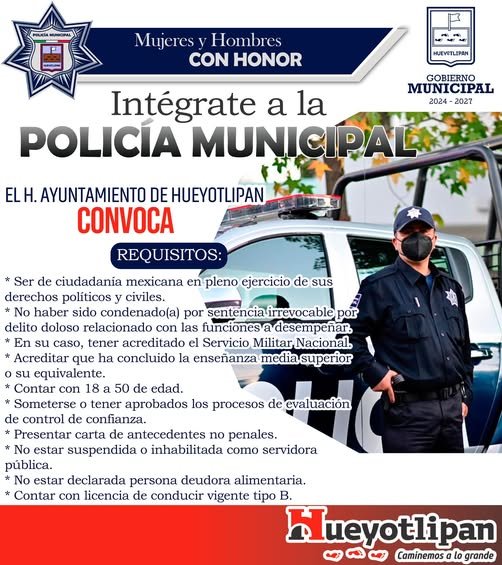 Tlaxcala, Tlax, a 29 de julio de 2025/Redacción/ El H. Ayuntamiento de San Idelfonso Hueyotlipan, encabezado por el alcalde Sostenes Bedolla Espinoza, invita a hombres y mujeres comprometidos con la seguridad, el orden y el bienestar de nuestro municipio a formar parte de la Policía Municipal.