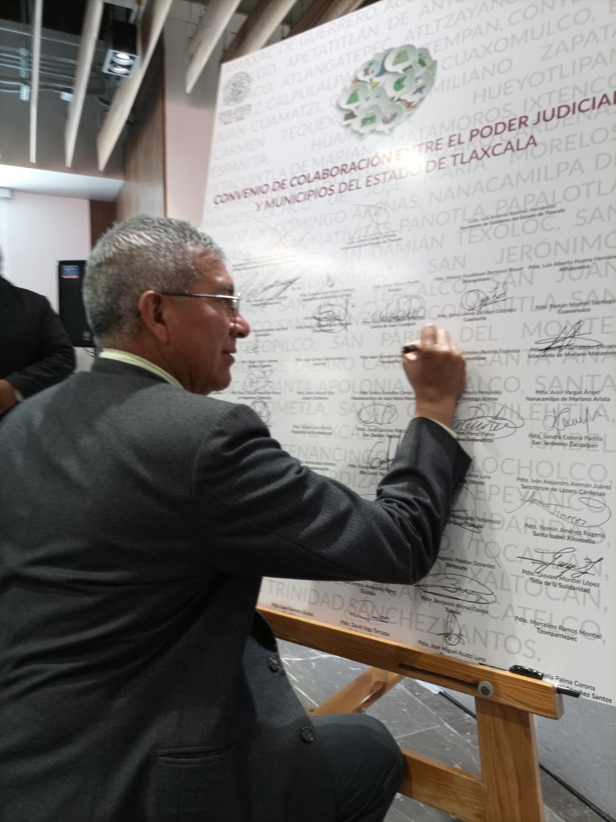 Tlaxcala, Tlax, a 24 de marzo de 2025/Redacción/ El H. Ayuntamiento de Hueyotlipan, encabezado por el presidente municipal, Sostenes Bedolla Espinoza, participó en la Firma de Convenio de Colaboración entre el Poder Judicial y los 60 municipios de Tlaxcala, acto en el que la gobernadora Lorena Cuéllar Cisneros como testigo de honor, destacó la importancia de la coordinación entre los tres niveles de gobierno para garantizar seguridad y justicia a la población.