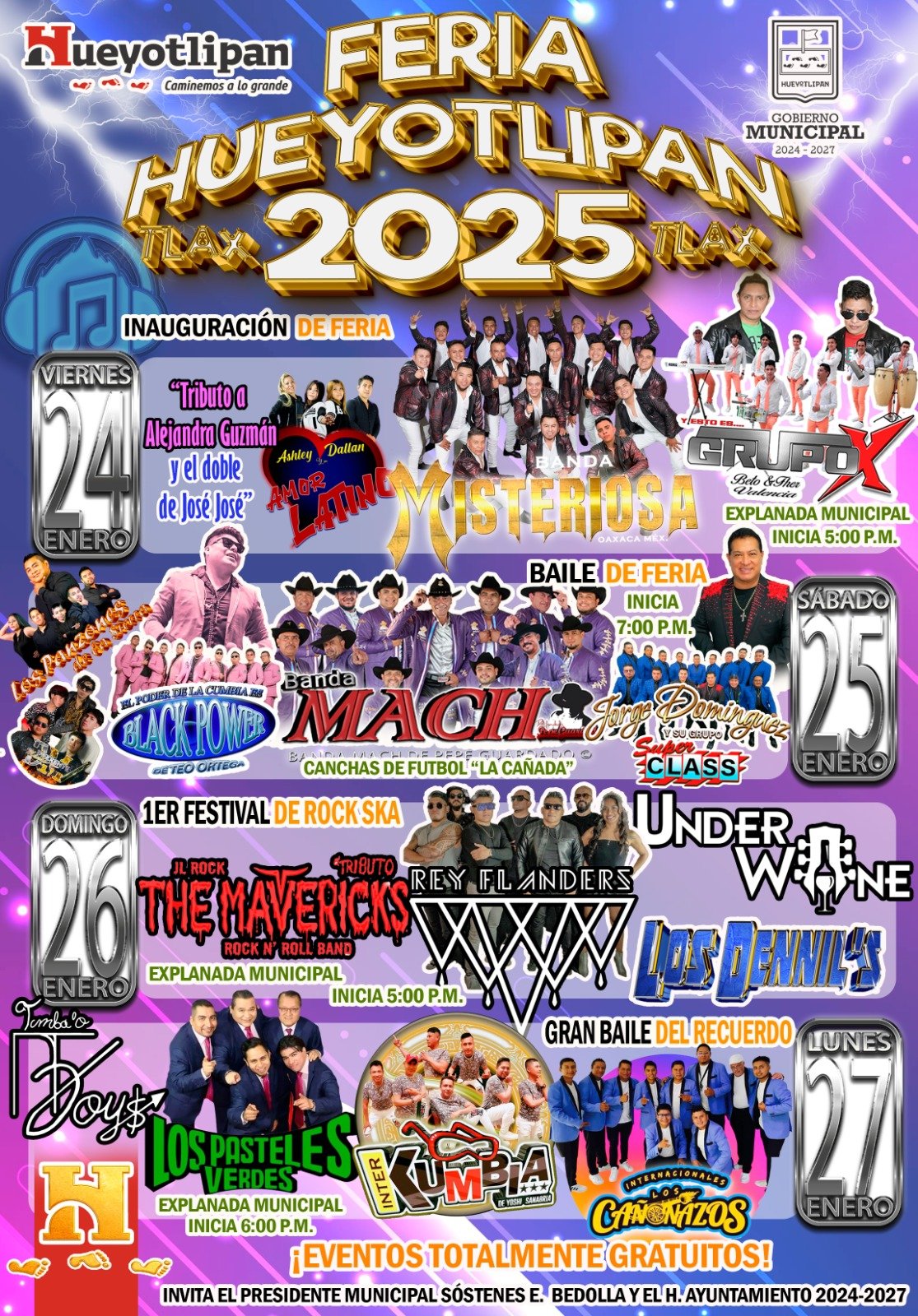 Tlaxcala, Tlax, a 12 de enero de 2025.- En el marco de la feria Hueyotlipan 2025, el gobierno municipal que encabeza el alcalde Sostenes Bedolla Espinoza, en coordinación con el cabildo y el Ayuntamiento presentaron el cartel general de los diferentes bailes que se llevaran a cabo del 24 al 27 de enero del presente año, en su mensaje el edil señalo buscamos que esta feria se diviertan chicos, jóvenes, adultos y nuestros abuelitos con lo que buscamos que se diviertan sanamente, los bailes habrá para todos los gustos el 1er festival de Rock Ska, música de banda y de grupos, así como tributos y nuestros abuelitos disfrutaran su música del recuerdo.