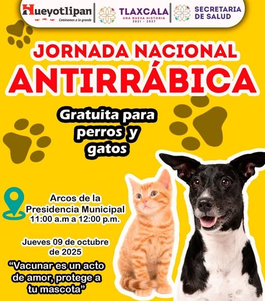 Tlaxcala, Tlax, a 8 de octubre de 2025/Redacción/ El H. Ayuntamiento de Hueyotlipan 2024–2027, que encabeza el presidente municipal Sostenes Bedolla, en coordinación con la Regidora de Salud Joselin Cruz Juárez, invita a toda la ciudadanía a participar en la Jornada Nacional Antirrábica.