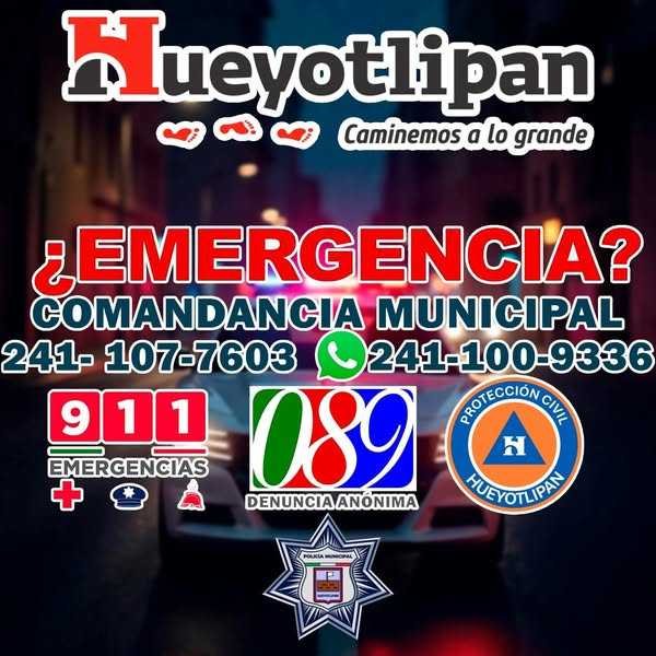 Tienes una emergencia, accidente automovilístico, alguna incidencia delictiva, comunícate al 241 107 7603 o al 241 100 9336 (WhatsApp) de seguridad pública o PC de Hueyotlipan, o al 911 Emergencias o al 089 denuncia Anónima.