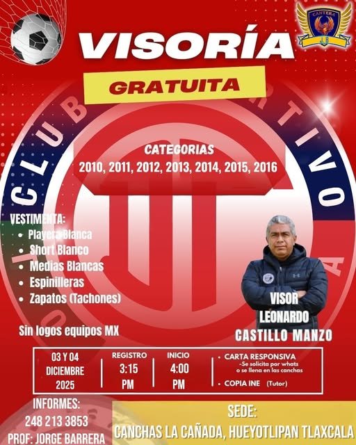 Tlaxcala, Tlax, a 27 de noviembre de 2025/Redacción/ El gobierno municipal de Hueyotlipan, que encabeza el alcalde Sostenes Bedolla Espinoza, invita a todas las niñas, niños y jóvenes de nuestro municipio a participar en la Visoria GRATUITA del Club Deportivo para las categorías 2010, 2011, 2012, 2013, 2014, 2015 y 2016.